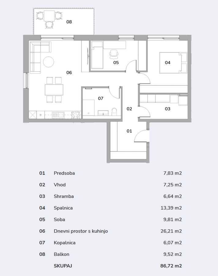 Blok ima dvigalo. Blok ima kolesarnico. Stanovanje ima troslojna pvc okna. Tla v stanovanju so iz trislojnega gotovega parketa (hrast). Tla v sanitarijah in kopalnico so iz keramike. Ogrevanje v stanovanju je na talno ogrevanje z lastno toplotno črpalko. Predpriprava za hlajenje stanovanjskih prostorov je izvedena. Blok je projektiran in grajen potresno varno v skladu z evropskimi in slovenskimi standardi. Za celotni tehnični opis nas kontaktirajte.